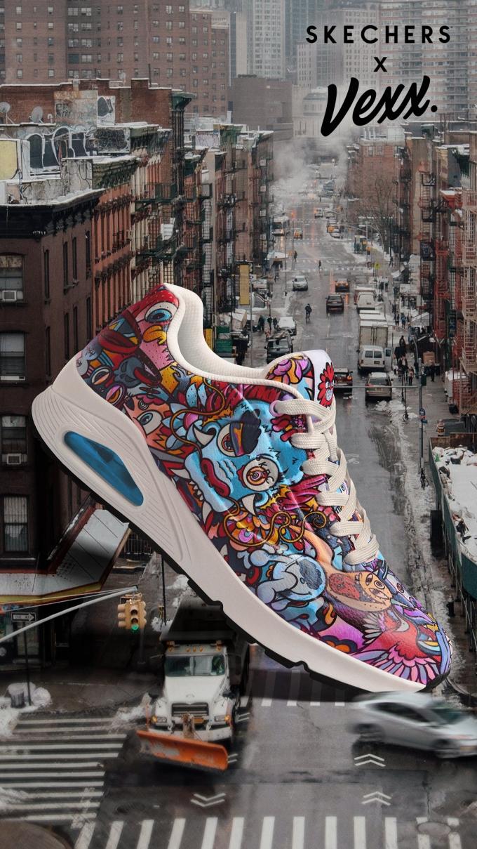 Po úspěšných dvou sezonách s umělci jako James Goldcrown, Jen Stark a Ricardo Cavolo, přichází třetí umělecké pojetí módy značky Skechers a prim v ní hrají VEXXovy charakteristické „čmáranice”, které jsou plné živých barev a hravých obrazů.