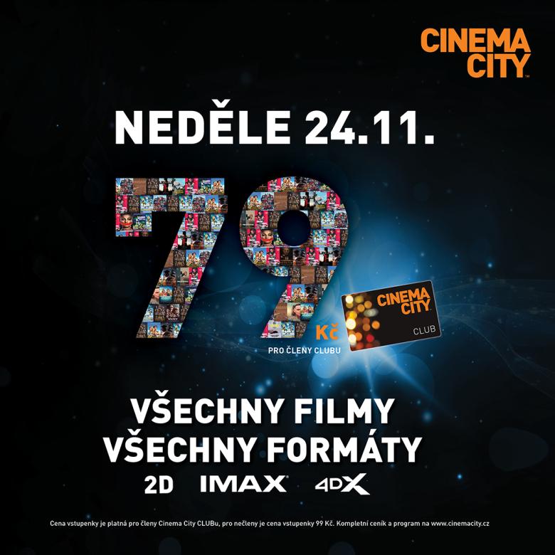 Akce probíhá v neděli 24. listopadu 2024 v multiplexech Cinema City po celé ČR. Cena vstupenek je již od 79Kč (platí na 2D, 4DX, IMAX, projekce pro členy Cinema City CLUBu). Pro neregistrované návštěvníky je cena vstupenky 99Kč. Návštěva kina pro vás bude výhodnější, pokud se stanete členy Cinema City CLUBu. Členstvím získáte mnoho výhod a slev. Dalším bonusem je newsletter, díky kterému získáte nejzajímavější novinky ze světa filmu či informace o jedinečných akcích jako první.