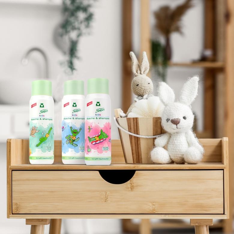 Pro hygienu celého těla a vlásků přináší značka Frosch sprchový gel a šampon pro děti 300 ml, který je vyvinut s recepturou zajišťující extra jemnou péči pro citlivou pokožku dětí. Šetrné složení umyje celé tělo a přidaný panthenol se postará o hydrataci. Výtažky z pšeničného proteinu usnadňují rozčesávání dětských vlásků a navrací jim vitalitu. Jemné složen neštípe v očích při mytí vlásků a je pH neutrální. Receptura neobsahuje mikroplasty, parabeny, EDTA, ropné složky, ani složky živočišného původu. Frosch Senses sprchový gel a šampon pro děti je k dostání je ve 3 barevných provedeních, to růžové, zelené a modré. Doporučená cena: 85,90 Kč.